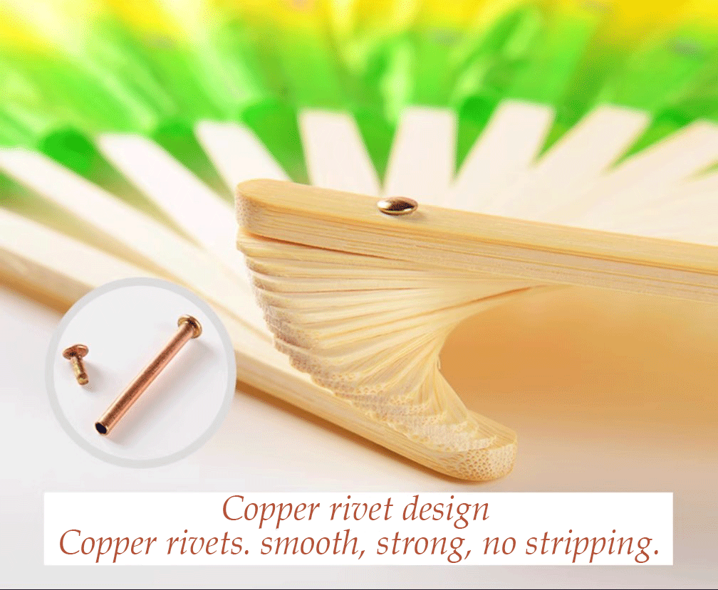 Our store uses exquisitely polished and thickened fan bones, which are strong and durable. The fan shaft is made of copper rivets, which are directly smashed and not easy to fall apart. The fan cloth is soft and flowing with bright colors.