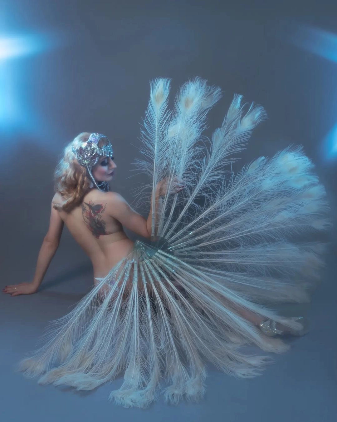 Each fan is handcrafted from real peacock feathers, known for their shimmering “eyes” that symbolize power and beauty in performance art.